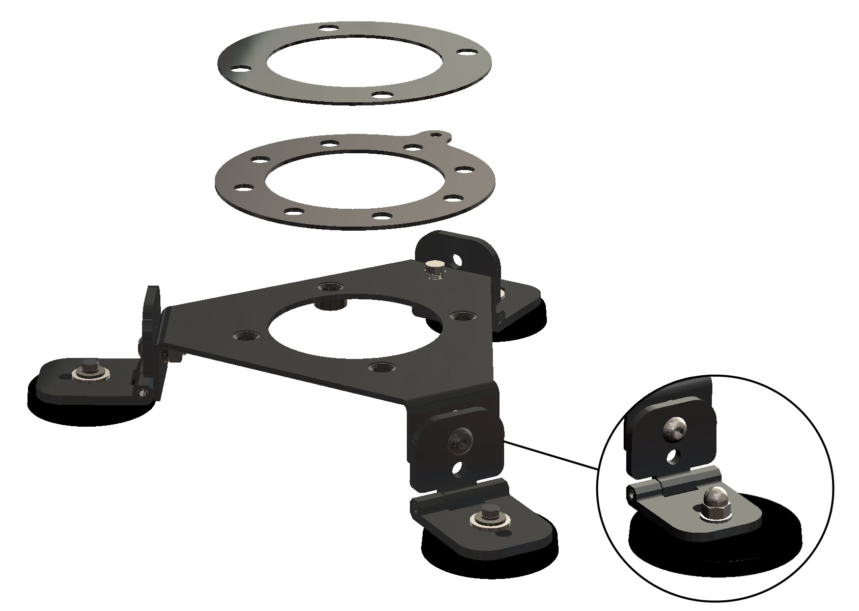 Field-proven solutions for fixation of antennas, sensors, and other equipment directly to ferromagnetic metal surfaces such as on a combat vehicle roof. The magnetic base has adjustable leveling and angles to adapt to different surfaces. The mount bracket is NATO 4-hole patterned M10 threaded. The mount can be supplied with various accessories such as ground plates, conductive gaskets or intermediate adapter plates to adapt to the required antenna or equipment that shall be mounted on top. Customized configurations are also available on request.